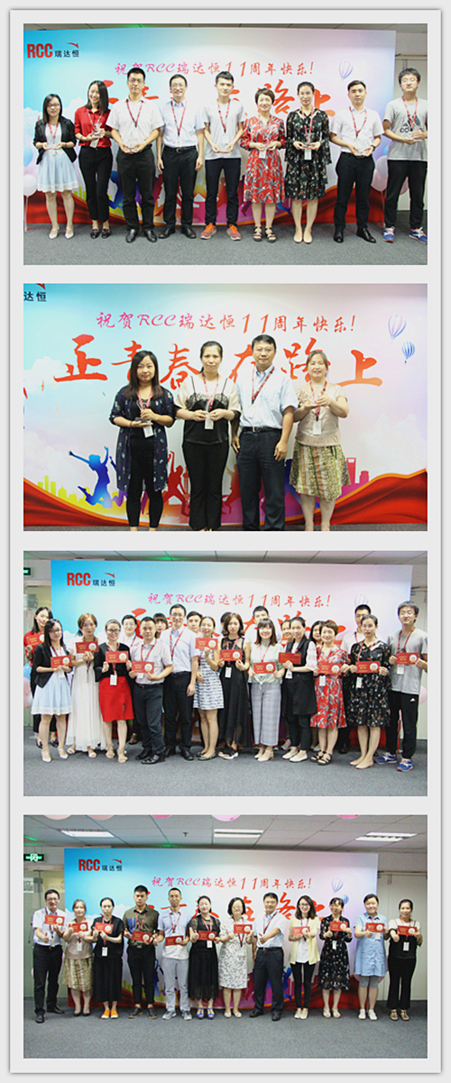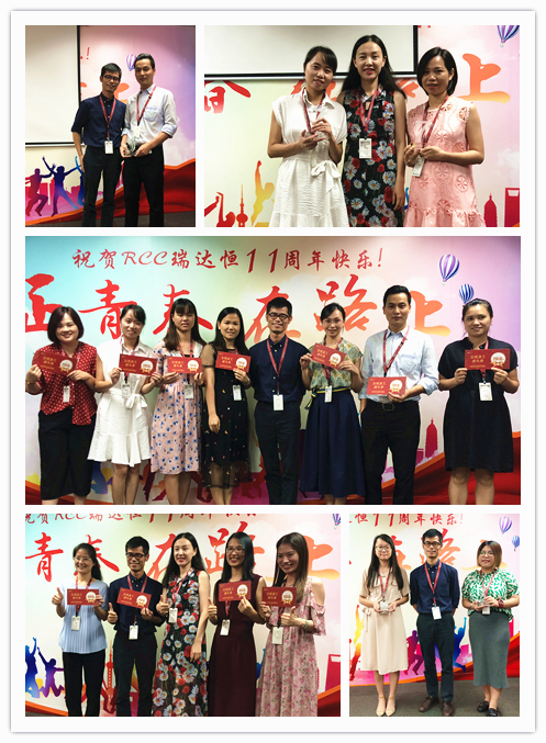 一段由RCC制作的十一周年慶視頻拉開了慶典活動(dòng)的序幕。視頻中,敘寫了這一年來公司取得的驕人成績與開展的活動(dòng)、PK戰(zhàn)中RCC員工們熱血的場面、客戶對RCC信息的評價(jià)片段、CEO在視頻中的致辭等內(nèi)容,震撼著每一名RCC人。RCC在2017——2018年所取得的諸多創(chuàng)新和進(jìn)步、輝煌的成就和永不止步的發(fā)展態(tài)度,讓在場的每一名員工都倍感光榮和自豪。一個(gè)個(gè)輕松活潑的環(huán)節(jié)讓整個(gè)活動(dòng)現(xiàn)場其樂融融,充分展現(xiàn)了RCC大家庭的團(tuán)結(jié)與溫暖,把氣氛推向了高潮。公司領(lǐng)導(dǎo)還為眾多在RCC工作三年或以上的員工頒發(fā)了“忠誠員工特殊獎(jiǎng)”,本次的頒獎(jiǎng)把原先贈(zèng)予金器的形式改為發(fā)放面額1000元到4000元的“成長券”形式,專門用于購買圖書、線上課程、健身卡,幫助老員工提升職場專業(yè)技能和能力、鼓勵(lì)他們積極鍛煉,保持健康的體魄。新的獎(jiǎng)品形式不僅代表著公司感謝忠誠員工與公司共成長的情誼,還表明公司對員工全面發(fā)展的高度重視,公司也將一如既往地為更多有能力、有思想的員工提供更為廣闊的發(fā)展空間。最后,在團(tuán)結(jié)與溫暖氣氛中,在全體RCC員工對公司的祝福里,公司十一周年慶典活動(dòng)落下帷幕。